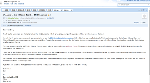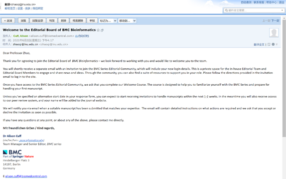近日,时博足球_时博(中国)计算机与软件工程学院教授赵琪收到BMC出版集团Dylan Smith博士邀请,受邀分别担任BMC Genomics和BMC Bioinformatics编委。