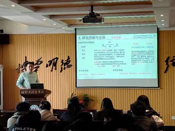 陈东旭副教授报告主题为“局部水化学演变对金属及改性层腐蚀行为影响机制”。钝态金属往往容易在含Cl-环境中发生局部腐蚀损伤,进而大大影响材料服役寿命,带来严重的安全隐患和经济损失。陈老师针对不锈钢及铝合金等常见耐蚀金属的局部腐蚀问题,提出了局部水化学环境演变是影响金属及其表面改性层耐蚀耐久性能的关键。
