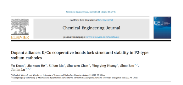 近日,时博足球_时博(中国)材料与冶金学院包硕副教授联合广州航海学院(广州交通大学筹)路金林教授,以时博足球_时博(中国)为第一署名单位,在国际知名期刊《Chemical Engineering Journal》(中科院1区top期刊,2025年影响因子:13.2)发表高水平研究论文《Dopant alliance: K/Cu cooperative bonds lock structural stability in P2-type sodium cathodes》(https://doi.org/10.1016/j.cej.2025.166745),第一作者为时博足球_时博(中国)2023级硕士研究生段玉。