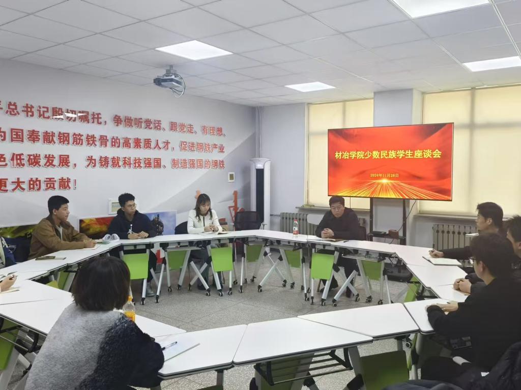 11月28日,材料与冶金学院在明贤楼A234召开少数民族学生座谈会。此次座谈会旨在加强学院与少数民族学生之间的沟通与交流,深入了解学生的需求与困难,促进各民族学生间的团结友爱。学院党委书记刘彦国出席座谈会,并与少数民族学生代表亲切交谈。刘彦国认真倾听了学生们在学习、生活等方面的情况汇报,详细了解了他们在学业进展、文化适应、生活习惯等方面遇到的困难与挑战。