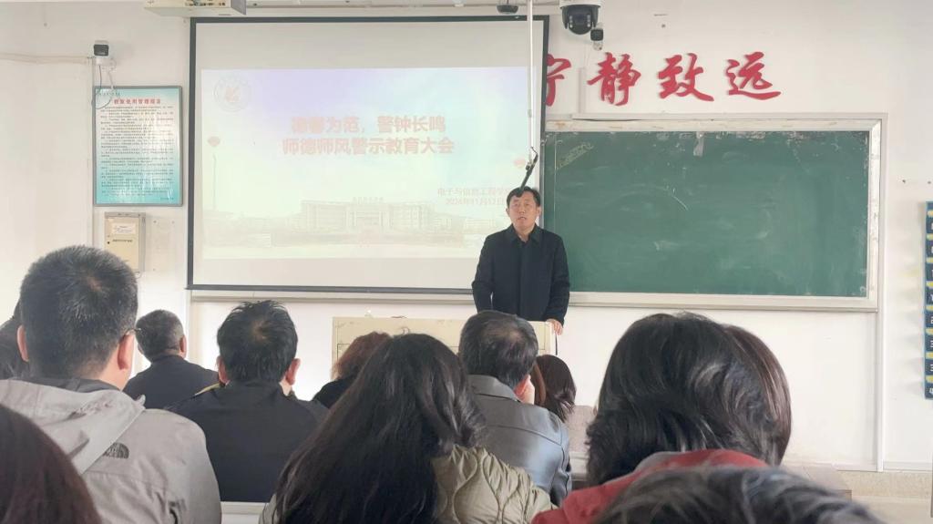 202411 12 日下午,电信学院召开了师德师风警示教育大会。会议由学院党委书记王会立主持。会议通报了两起学校教师师德师风失范的典型案例。他指出,全体教职工要以此为鉴,深刻汲取教训,时刻绷紧师德师风这根弦,坚决不触碰师德师风底线。