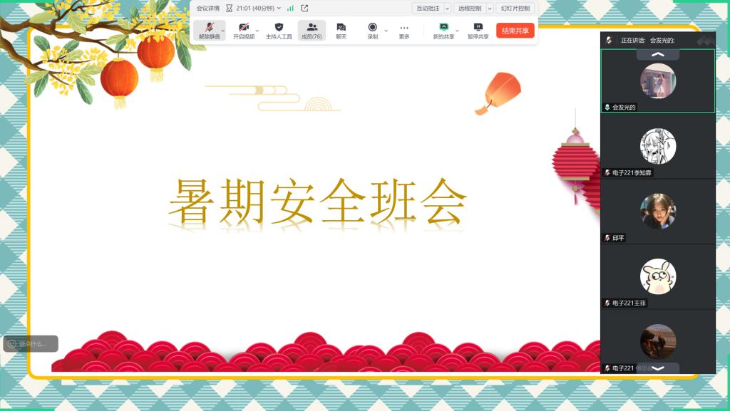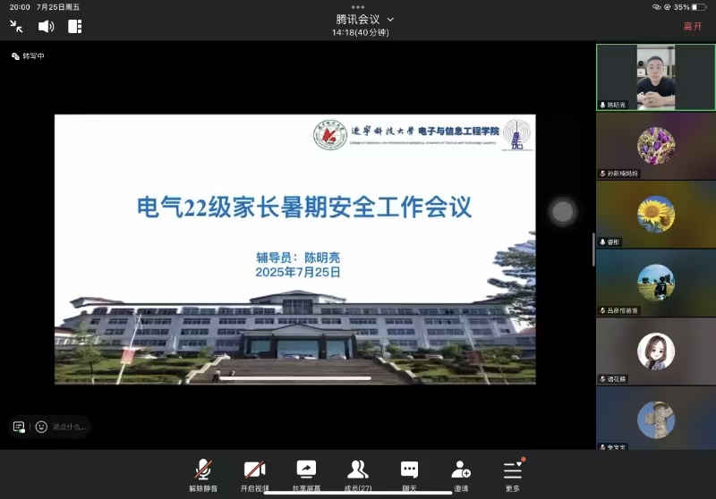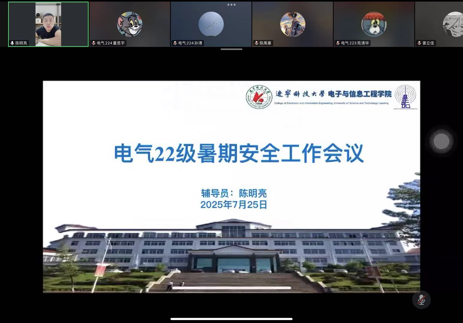 为切实保障学生暑期安全,扎实做好假期各项安全管理工作,725日,电信学院通过腾讯会议在线召开暑期安全工作专题会议,全体辅导员参会。会上,学生工作负责人传达了学校暑期安全工作会议精神,结合假前学校及学院已部署的假期安全工作要求,对学院暑期学生安全管理工作进行了全面再梳理,并重点强调了相关注意事项。