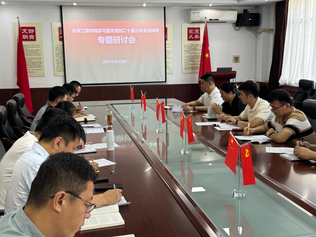 8月28日,在博观楼B325会议室,化学工程学院组织召开学习宣传党的二十届三中全会精神专题研讨会。会议由学院党委书记董德主持,学院班子成员、副科级以上领导干部、党支部书记及系主任参加会议。