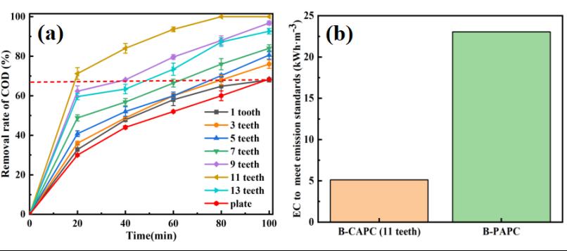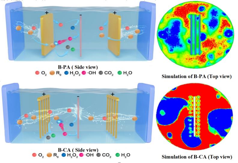 电-Fenton技术有高效、便捷、模块化布置等特点,在污水领域具有显著优势,但由于现有装置存在传质效率低的缺点,导致电-Fenton污水处理能耗高企,限制了电-Fenton技术在实际工业废水中的应用。合理优化电-Fenton体系设计,改善传质是解决该问题的必由之路。该团队通过对电-Fenton技术的电场效应和阴阳极氧化协同效应的深研究,首次提出了借助梳状电极提供传质通路和有效电场的策略,采用CFD模拟技术优化电极设计,成功的研发了新型双侧梳状阳极电-Fenton装置,大幅提高了装置内部传质效率,降低了电-Fenton能耗。借助该策略设计的新型双侧梳状阳极电-Fenton装置,在处理焦化废水和石油化工废水研究中取得了优秀效果,经20分钟处理,可使焦化废水和石油化工废水COD达到排放标准,与当前同类装置相比能耗可降低60~80%。