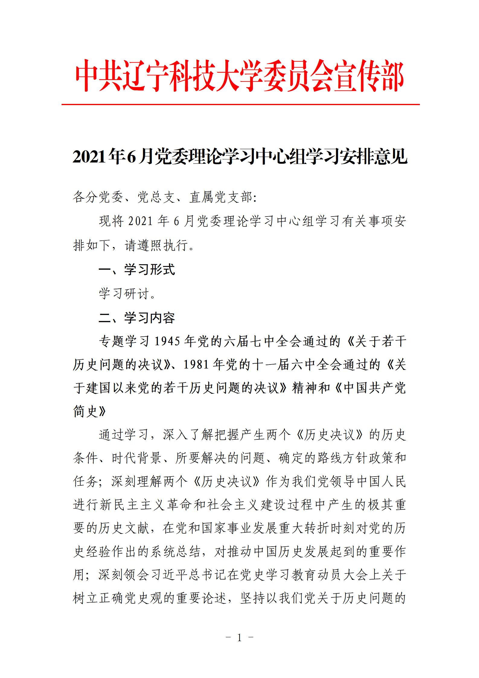 2021年6月党委理论学习中心组学习安排意见