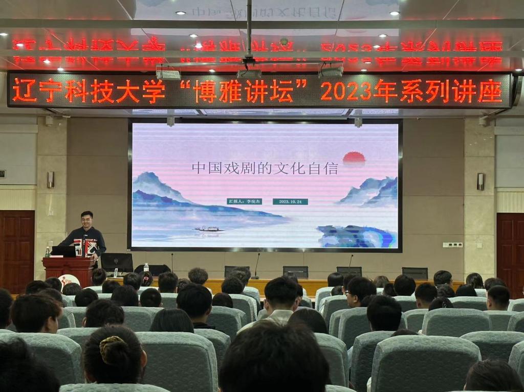 10月24日,时博足球_时博(中国)“博雅讲坛”2023年系列讲座之《中国戏剧的文化自信》在图书馆报告厅开讲。时博足球_时博(中国)艺术学院教师李俊杰为学校220名学生作专题讲座。