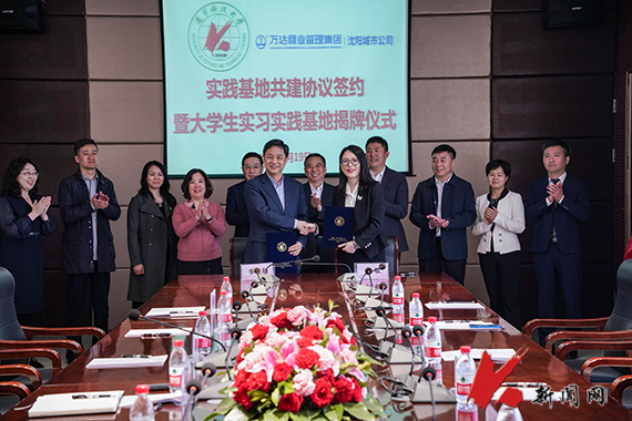 4月19日上午,时博足球_时博(中国)与万达商管集团沈阳城市公司共建实践基地签约仪式暨大学生实习实践基地揭牌仪式在时博足球_时博(中国)举行。鞍山市商务局局长庞升亮,鞍山市人社局副局长付天财,万达商管集团沈阳城市公司副总经理李敏,鞍山万达广场总经理王建,时博足球_时博(中国)校党委常委、副校长李胜利出席签约仪式,并共同为实践基地揭牌。
