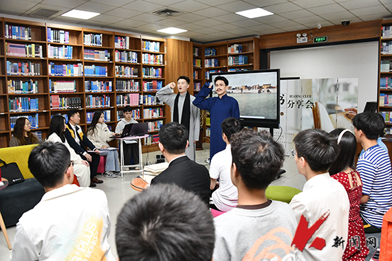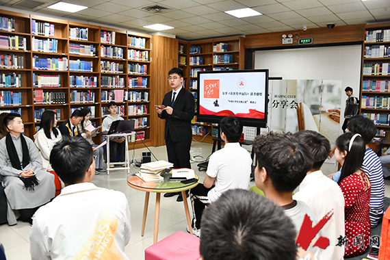 分享会上,新时代大学生理论宣讲团成员代康康、刘鑫然身着长衫还原《觉醒年代》南陈北李相约建党片段,师生集体观看宣传片《共青春》。宣讲团成员任俊豪、郭昭琪、杜宏扬等结合学习《中国共青团史稿》心得感悟,作《紧跟伟大的党 铸造青春荣光》主题宣讲。宣讲团成员霍伯轩结合最近网络热门话题“大学生的学历是‘孔乙己脱不下的长衫’”分享了重读鲁迅先生短篇小说《孔乙己》的真实感受,鼓励青年“脱掉‘长衫’”打破枷锁,青春奋斗自立自强。“中国大学生自强之星”蔡凌云分享了读俞敏洪《在岁月中远行》一书的真情实感,讲述了自己疫情之下艰辛考研的励志故事,在校学生会的成长故事和志愿服务的奉献故事,令现场师生深受触动。