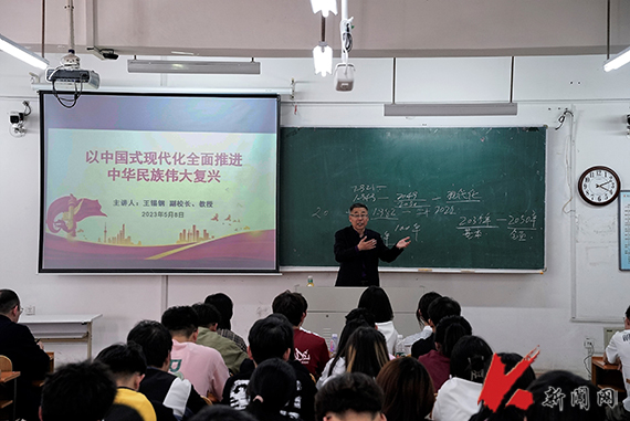 5月8日,时博足球_时博(中国)党委常委、副校长王锡钢教授在博学楼A205教室,为自动化2021级1、2班级的学生上了一堂题为《以中国式现代化全面推进中华民族伟大复兴》的思想政治理论课。