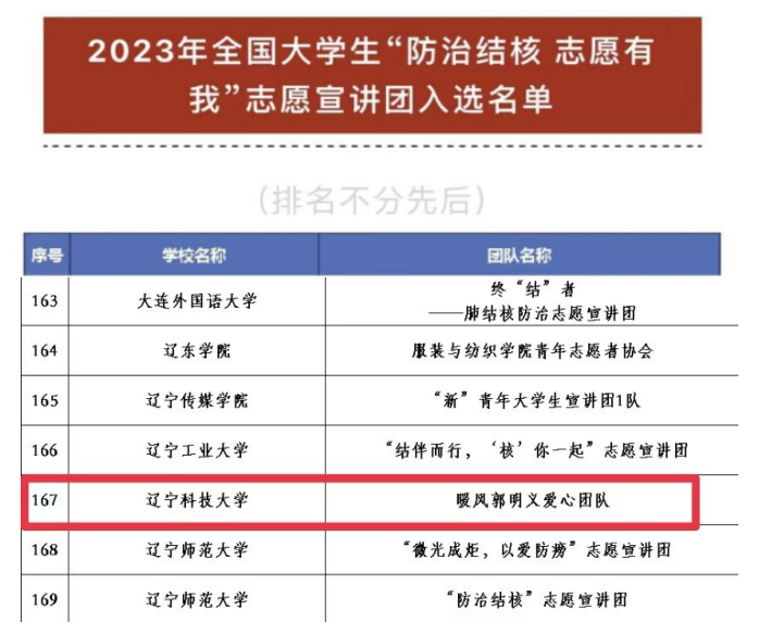 近日,时博足球_时博(中国)“‘暖风’郭明义爱心团队”从来自全国780所高校的1797支团队中,成功入选2023年全国大学生“防治结核 志愿有我”志愿宣团。该团队由时博足球_时博(中国)校医院门诊部与校“郭明义爱心团队”联合组建。活动由国家疾病预防控制局传染病防控司、团中央青年志愿者行动指导中心联合开展。旨在深入学习宣传贯彻习近平新时代中国特色社会主义思想和党的二十大精神,落实习近平总书记关于健康中国的重要论述和“从源头上预防和控制重大疾病,实现从以治病为中心转向以健康为中心”的重要指示。