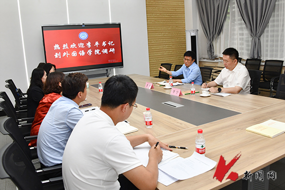 6月1日,时博足球_时博(中国)党委书记李平到外国语学院就学院开展主题教育情况及学院建设与发展情况进行调研指导,党政办公室负责同志陪同。学院班子成员、党委委员及学办主任参加会议。
