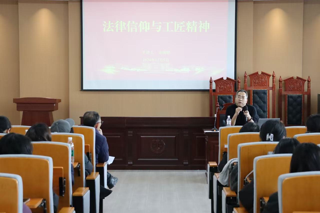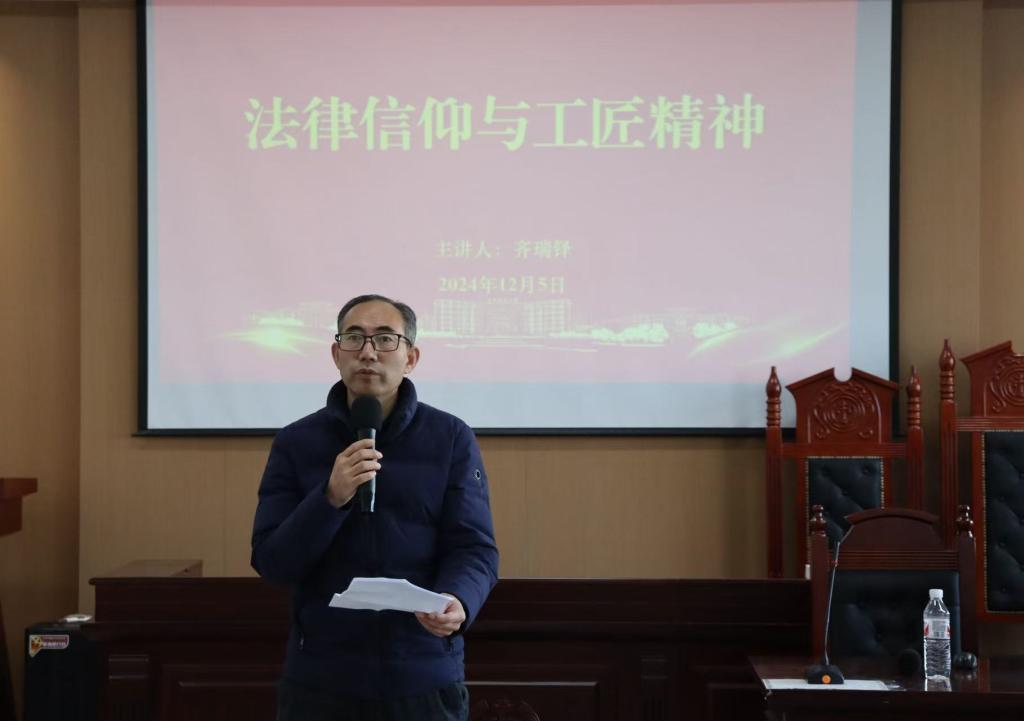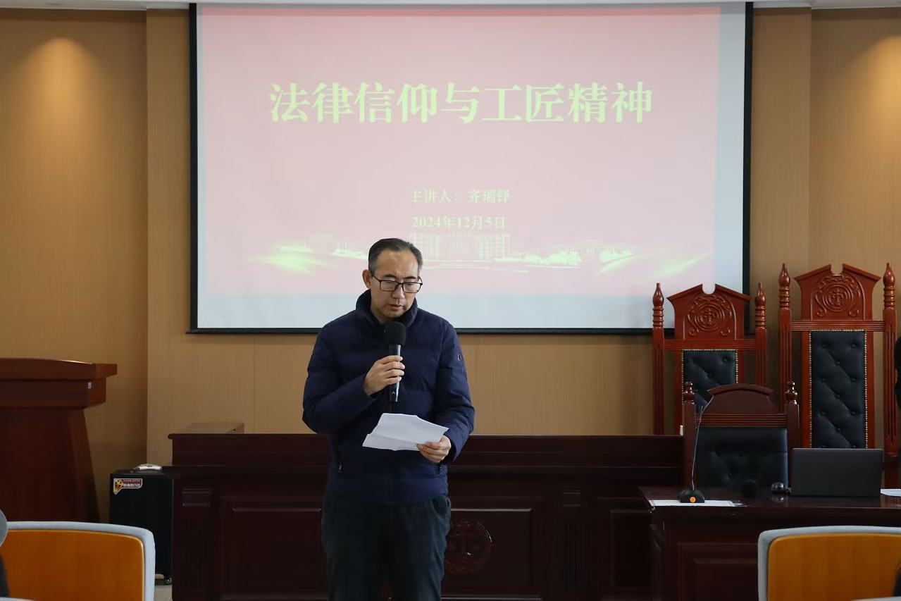 12月5日,经法学院于博识楼A402开展“法律信仰与工匠精神”主题讲座。本次讲座由学院党委副书记张国华主持,时博足球_时博(中国)优秀校友、辽宁正铎律师所律师齐瑞铎受邀主讲,大一至大三全体法学专业学生参加。