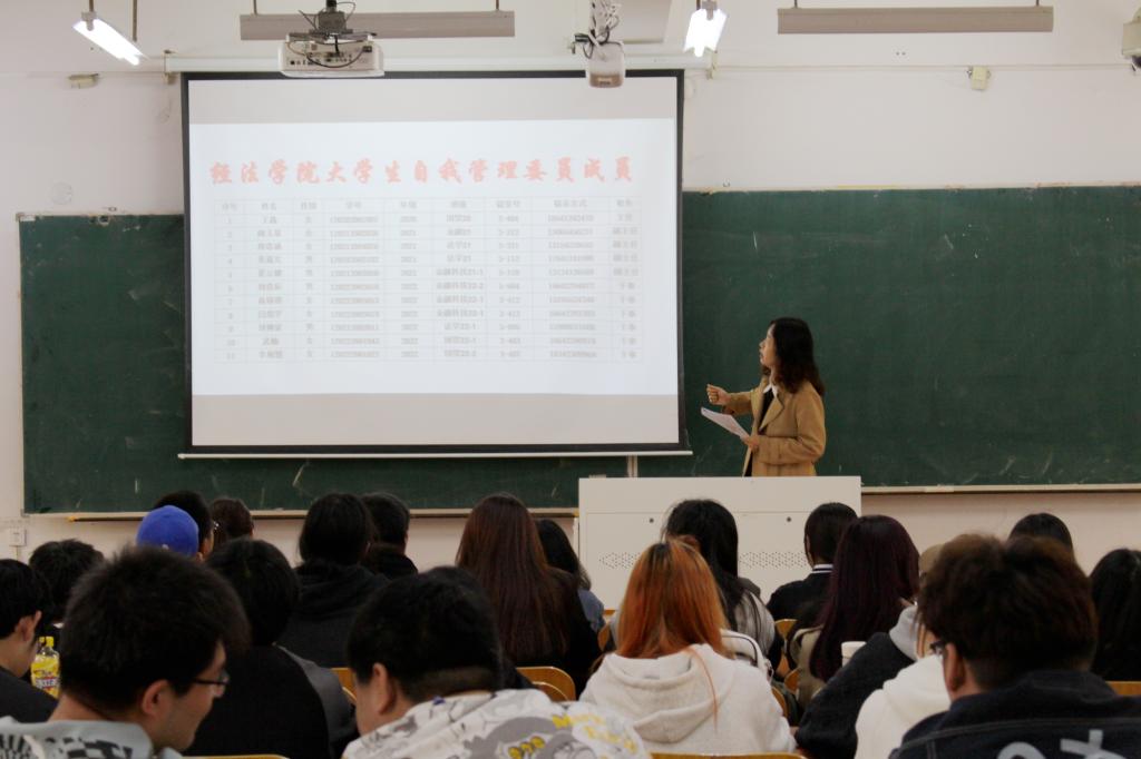 齐艳萍公布了新一届经法学院大学生自我管理委员会名单,学院学生会执行主席代郁璇带领全体同学进行宣誓,要做一个有理想、敢担当、能吃苦、肯奋斗的新时代好青年。