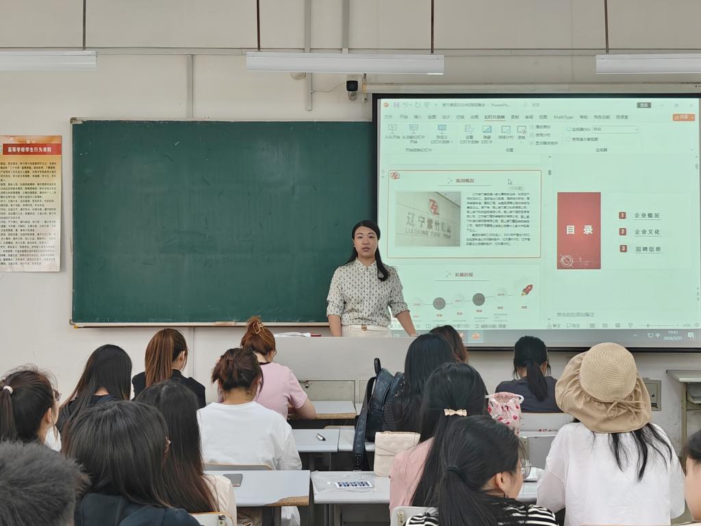 会议伊始,张鹏飞老师首先对辽宁紫竹集团的到来表示欢迎,并希望同学们能够把握本次机会,找到一份令自己满意的工作。随后,辽宁紫竹集团人力资源部王莹莹围绕企业概况、企业文化、招聘信息三方面进行宣讲。通过工作场景照片的展示,同学们深刻感受到了该企业严谨的工作作风和“自强不息,产业报国”的企业精神,而企业成员们的团建合照则是生动诠释了“温度职场”,使同学们感受到了良好的工作环境和团结向上的工作氛围。最后,王莹莹围绕招聘要求、薪资福利、招聘渠道等为同学们进行详细讲解,表示该企业十分重视人才培训和培养计划,欢迎同学们怀揣着一份梦想加入紫竹集团,与之携手进步、共创未来!