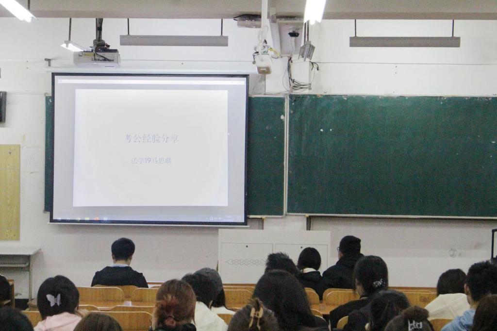 法硕20沈逍、法学19马思琪则分享了自己的考公经验。两名同学从前期准备、言语理解、判断推理以及面试技巧几个方面向大家进行了详细的介绍,以“关关难过关关过,前路漫漫亦灿灿”引出在备考过程中要始终保持坚持不懈的态度和积极平稳的心态,他们鼓励学弟学妹要勇于面对各种挑战,用行动与汗水战胜一切困难,前方之路必定光明璀璨。