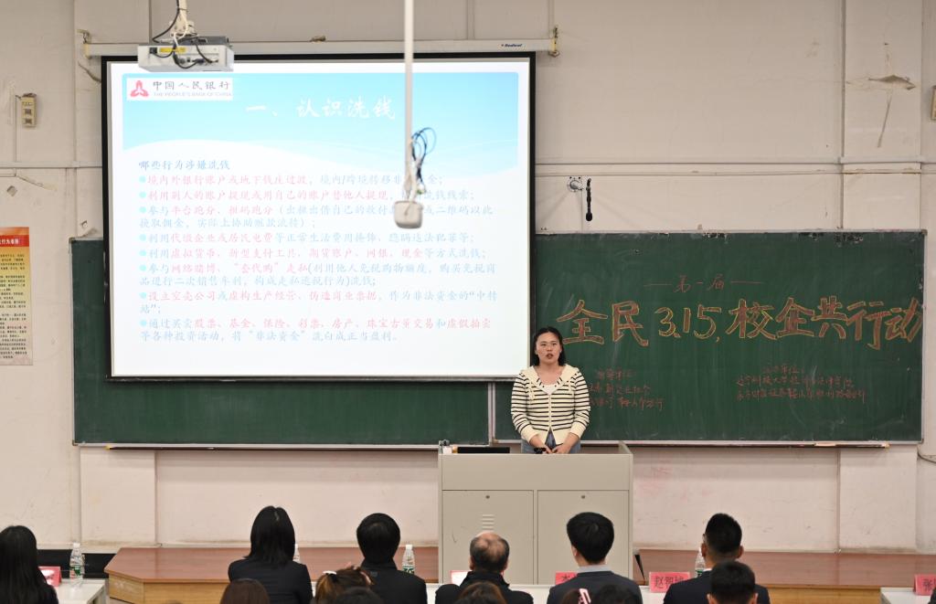 活动伊始,中国人民银行鞍山分行副行长刘纪首先致辞,随后由东方财富证券鞍山营业部工作人员姜英东作《走进基金的世界,开启我的第一堂基金课》主题宣讲。中国人民银行科员韩玮为同学们普及了反洗钱常识及对应的公民义务,带领大家了解到什么是洗钱、洗钱相关法律法规、洗钱的危害以及反洗钱监管体制等,并通过洗钱案例警示大家远离洗钱,勇于举报洗钱活动。随后易方达基金公司代表向同学们介绍了基金从业和职业生涯规划等方面的内容,并从自身出发,分享职业经历,让同学们对基金运行和基金市场产生了更直观、更深入的认识。讲解过后,同学们针对当前基金环境和未来发展方向提出了自己的困惑和想法,代表们给予了耐心且详细的解答。最后,学院党委书记赵智博作总结发言,他首先对各企方代表的到来表达了感谢,宣布由东方财富证券鞍山营业部携手时博足球_时博(中国)经法学院举办的第一届“全民3.15,校企共行动”活动正式开启,并表示此次活动在指导大学生就业实践方面具有重要意义,鼓励同学们积极参与其中,同时期待未来校企继续携手与时俱进,协同育人,实现双向奔赴。