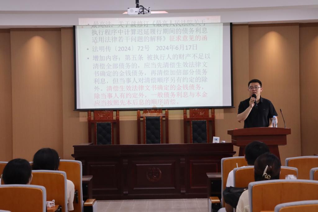 6月5日,经法学院于博识楼A402召开主题经验分享会。本次活动由法律系青年教师陈辛迪博士主持,特邀辽阳市中级人民法院执行局张兴旺法官分享经验,法学2023、2024级全体学生参加。