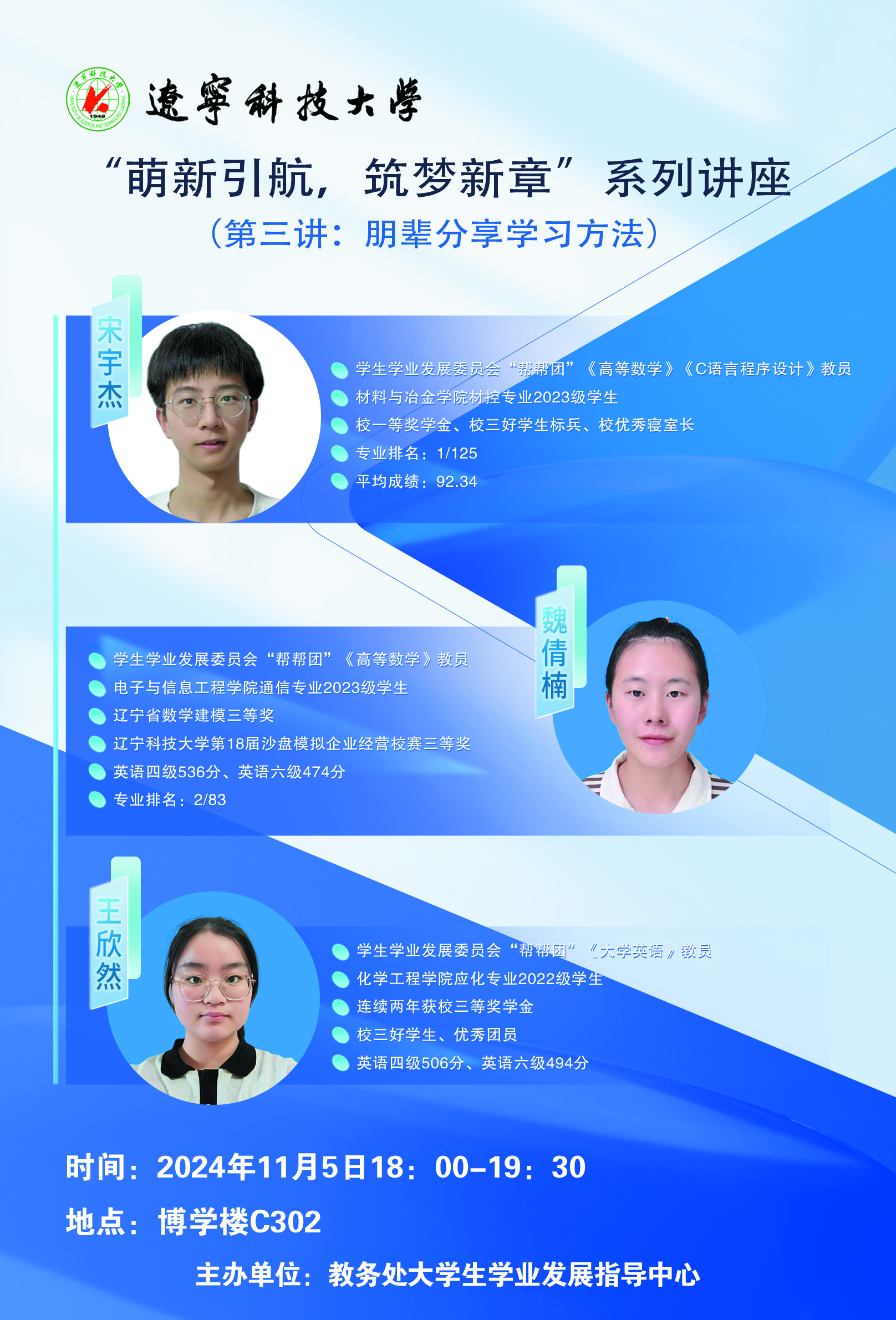 11月5日,教务处大学生学业发展指导中心面向2024级新生举办的“萌新引航,筑梦新章”系列讲座第三讲在博学楼C302教室开讲。时博足球_时博(中国)学生学业发展委员会“帮帮团”教员魏倩楠、王欣然、宋宇杰为学校300余名新生作《朋辈分享学习方法》专题讲座。