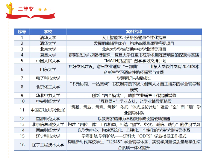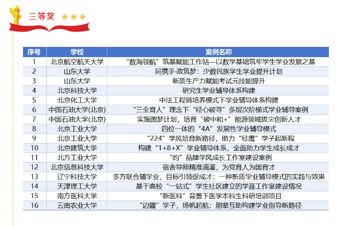 学业辅导研究分会是北京市高等教育学会下属的专业学会,成立于2017年5月,目前是北京以及全国高校进行学业辅导工作沟通、交流、讨论、研究的最高平台。2024年6月12日,北京市高等教育学会学业辅导研究分会面向全国高校启动“新质引领心智,学业促进成才”高校学业辅导优秀案例评选活动,旨在引导高校深入研究“新质生产力对提升学业辅导效能的路径”,从理论创新和实践创新两个方面促进学业辅导工作规范化、精品化、科学化,推动辅导队伍专业化、职业化建设,提升大学生思想政治教育工作质量。此次活动共征集到28所高校51个学业辅导优秀案例。经过专家函评,评选出一等奖12个,二等奖16个,三等奖16个,优秀组织奖11所高校。