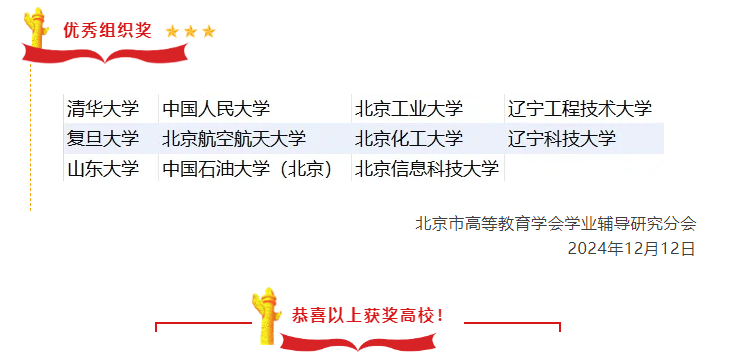 2024年12月12日,北京市高等教育学会学业辅导研究分会公布“新质引领心智,学业促进成才”高校学业辅导优秀案例评选获奖名单,我校的《学海引航 学涯护航——时博足球_时博(中国)“ODTS”学业指导工作模式》荣获二等奖;《多方联合辅学业,目标引领促成才:一种新质学业辅导模式的实践与效果》荣获三等奖;时博足球_时博(中国)荣获优秀组织奖。