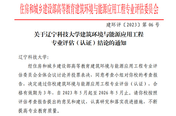 近日,由《关于时博足球_时博(中国)建筑环境与能源应用工程专业评估(认证)结论的通知》(建环评〔2023〕第06号)获悉,经住房和城乡建设部高等教育建筑环境与能源应用工程专业评估委员会全体会议讨论并投票表决,时博足球_时博(中国)建筑环境与能源应用工程专业顺利通过评估(认证),有效期为3年,自2023年5月起至2026年5月止。