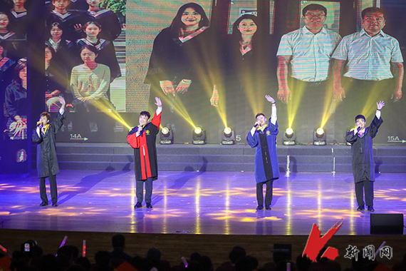 在院系大点名环节,各学院2025届毕业生代表手持院旗逐一登台,展演最后,校旗、院旗在舞台上迎风飞舞,毕业学子共同祝愿母校桃李天下、再谱新章。