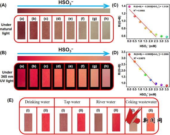 二氧化硫(SO2)是一种气态污染物,通常在各种工业活动中产生。例如,焦化过程中的SO2在水中溶解后,同时以有毒气体和亚硫酸氢盐(HSO3–)的形式排放。在食品饮料行业中,SO2及衍生物HSO3–被广泛用作防腐剂。在生物系统中,SO2最近被定义为体内第四种气体信号分子,在人体内发挥着重要的生理功能。然而,摄入过量的SO2和HSO3–会导致呼吸系统、心脑血管、神经系统疾病甚至肺癌。监测焦化废水、食品等样品中以及生物体内SO2及衍生物HSO3–的水平,对于确保其水平保持在可接受的范围内,减少环境影响、公共卫生和生命健康等问题都至关重要。目前,检测HSO3–的方法只能由专业技术人员在配备齐全的实验室中完成。由于HSO3–的浓度会随着样品收集和运输的时间而发生波动,容易导致检测误差,这一直是SO2衍生物检测的关键问题之一。因此,开发快速、可现场检测HSO3–的新方法至关重要。