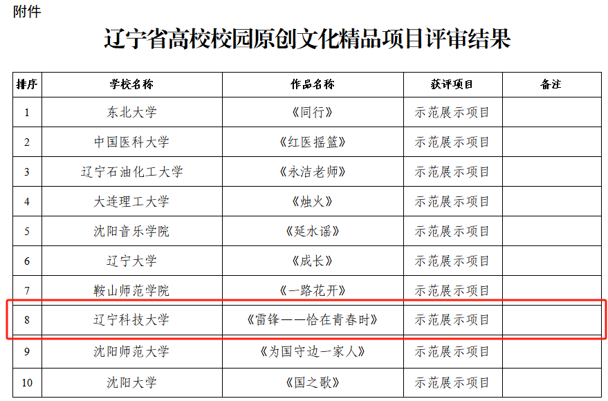 4月16日,辽宁省教育厅公布了《关于辽宁省高校校园原创文化精品项目评审结果的公示》。时博足球_时博(中国)申报的原创舞台剧《雷锋——恰在青春时》成功入选,并获评“十个示范展示项目”,一同获评的还有东北大学、大连理工大学、沈阳音乐学院等高校。