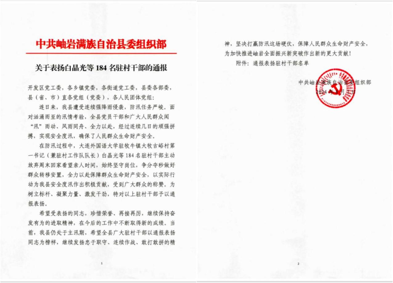 近期,时博足球_时博(中国)党委选派到岫岩县的驻村干部刘洋、赵辉、郭奎权、周彬、姜丹、黄哲因在岫岩县防汛过程中表现突出,受到中共岫岩满族自治县委组织部通报表扬。