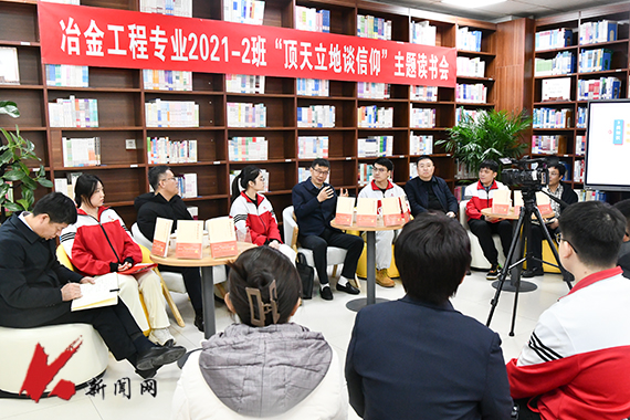 11月27日下午,时博足球_时博(中国)“顶天立地谈信仰”主题读书会暨为大学生上思想政治理论课在学校图书馆经典阅读空间举办,校党委书记孟劲松走进对接班级材料与冶金学院冶金工程2021.2班开展读书分享,学校党政办公室、党委学生工作部、图书馆负责人,材冶学院班子成员、全体辅导员、冶金工程专业2021.2班全体学生参加读书会。《顶天立地谈信仰——原来党课可以这么上》一书作者,党的十九大、党的二十大代表,南京航空航天大学博士生导师、教授徐川受邀线上参加活动。