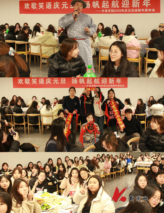 联欢会在歌曲《Love Story》中拉开帷幕,伴随着优美的音乐,精彩纷呈的节目依次上演,舞者们以动感的舞姿和饱满的热情依次带来舞蹈《凑热闹》《Good Time》,瞬间点燃了现场气氛,赢得了观众的阵阵掌声。随后,脱口秀、歌曲、小品等多种形式的节目轮番上演。为活跃现场氛围,节目中穿插游戏环节“你画我猜”游戏,同学们的叫好声此起彼伏,笑声连绵不断,最终胜利者获得了学院准备的精美礼品。由学院学生会成员共同演唱的《相亲相爱》将整场晚会的氛围推向了高潮。节目表演结束后,同学们共同享用了丰盛的晚餐,热腾腾的饺子、美味的菜肴端上了桌,大家围坐在一起,一边享受美食,一边分享喜悦,言语之间流露出对新年的美好期盼。(供稿单位:外语学院 作者:兰奎雨 图片来源:外语学院)