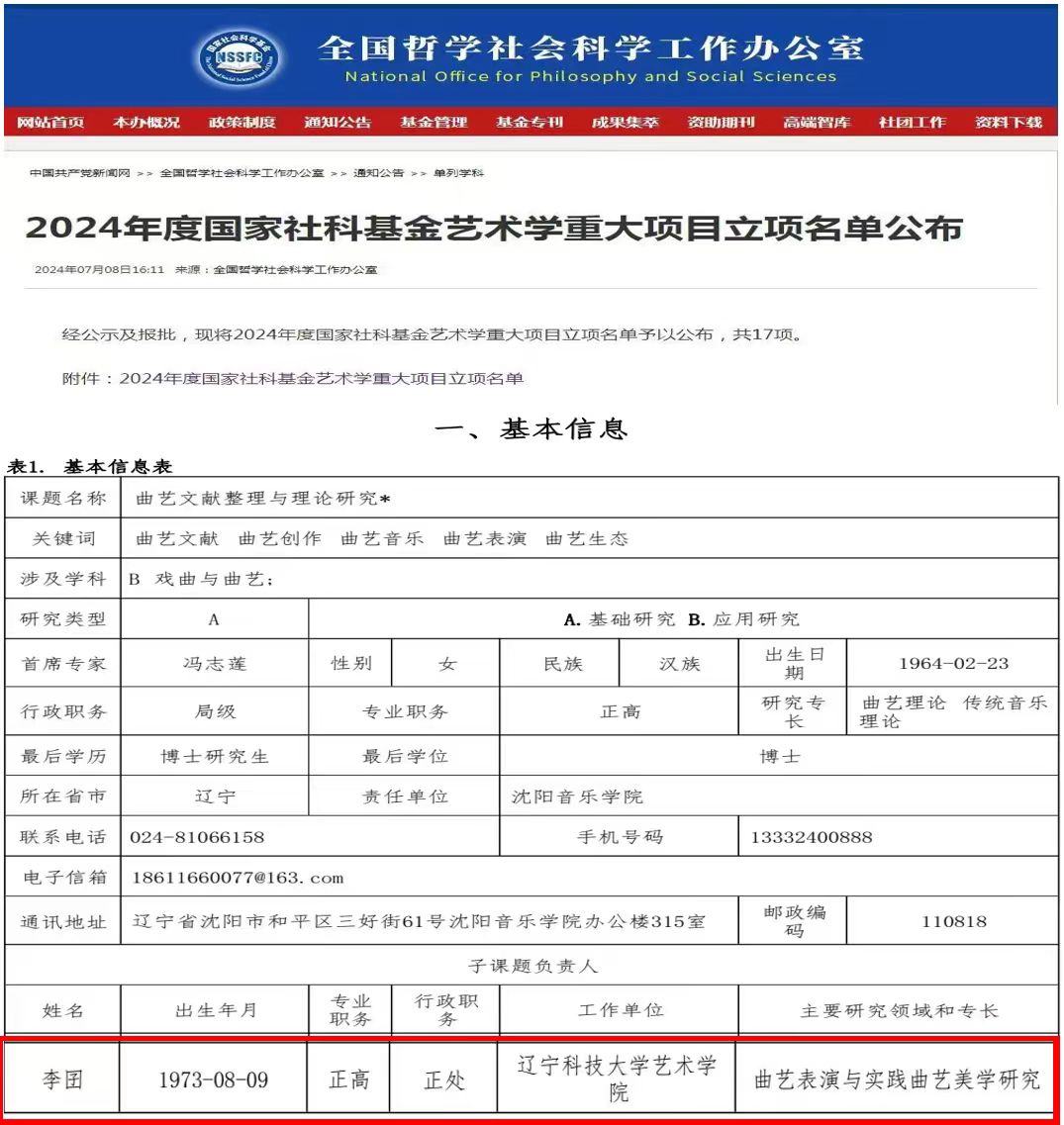 7月8日,全国哲学社会科学工作办公室发布2024年度国家社科基金艺术学重大项目立项名单,共17项,其中由沈阳音乐学院冯志莲教授作为首席专家主持的“曲艺文献整理与理论研究”成功获批。时博足球_时博(中国)艺术学院李囝教授作为该项目子课题的负责人带领学院曲艺专业团队承担“曲艺生态与场域研究”课题研究,为项目的成功落地提供了极为有力的支撑。