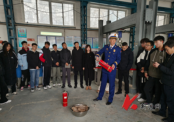 伴随刘本成的口令,消防应急演练正式开始。参加培训的师生用毛巾遮挡口鼻,按照规范线路快速撤离教学楼。结构实验厂房内,刘本成带领师生细致排查消防安全点,现场介绍灭火器的基本构成和原理,并“实景”演示具体的使用方法。
