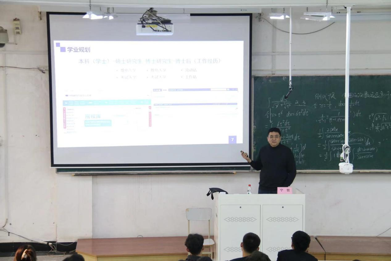 宁哲博士以“就业引航筑未来,青春建功新时代”为主题,为现场的同学们开展学业规划和就业指导讲座。报告中,宁哲教授结合我校冶金工程专业的的发展历程、研究方向、师资队伍、专业特色及取得的主要成就,让同学们对在自己所学专业有了更清晰全面的认识,从而更好地选择自己的学习方向和职业规划。其次,以升学为发展目标,为同学们详细介绍了考研的基本流程、备考方法、考试技巧等方面,让同学们为未来的考研深造之路做好充分准备。最后,根据当前冶金行业的发展状况重点分析了近年来冶金工程专业的就业形势、薪资待遇和职业发展路径,激发学生对职业规划和未来发展的深入思考和精准规划。