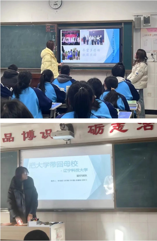 1月17日至22日,由侯婧楠、宋昀霏、张佳妮、马籽暄、郑斯文五位同学组成的“蛋仔派队”在鞍山市第五中学、沈阳市共青团实验中学、鞍山市育英中学等学校开展了“把我的大学带回母校”社会实践活动。他们向学弟学妹们讲述自己在时博足球_时博(中国)的故事,让他们更加深入了解了真正的大学生,大学生活是什么样,使他们对大学有了更多的憧憬与遐想。在时博足球_时博(中国),她们不仅收获了丰富的知识和技能,更收获了交心的朋友和难忘的回忆。这次的活动让她们有机会把这些宝贵的财富带回母校,与学弟学妹们分享。并通过发放调查问卷的形式收集学弟学妹们的升学意向、未来规划以及对大学生活的期待。作为新一代大学生,肩负着时代责任,更应牢记初心,不忘使命,让青春在全面建设社会主义现代化国家的火热实践中绽放绚丽之花。