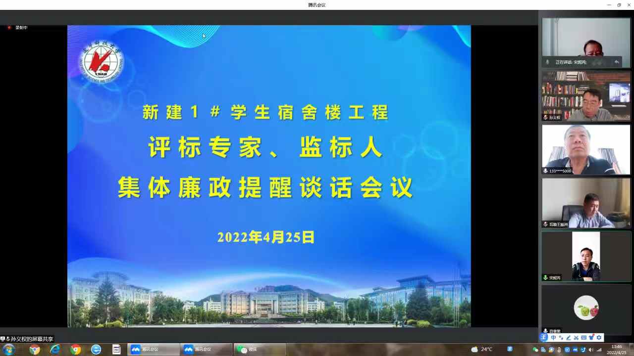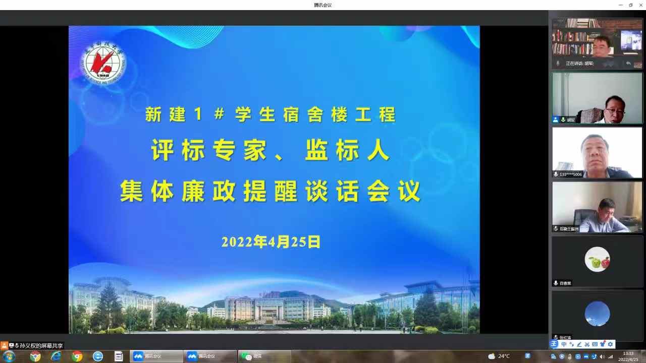 4月25日下午,学校召开新建1#学生宿舍楼工程招标采购评标专家、监标人集体廉政提醒谈话会议,会议由副校长胡军主持,纪委书记宋明凯、纪委副书记金福尧、招标采购管理中心主任付忠汉出席会议,两名评标专家及三名监标人参加会议。会议通过腾讯会议在线上召开。